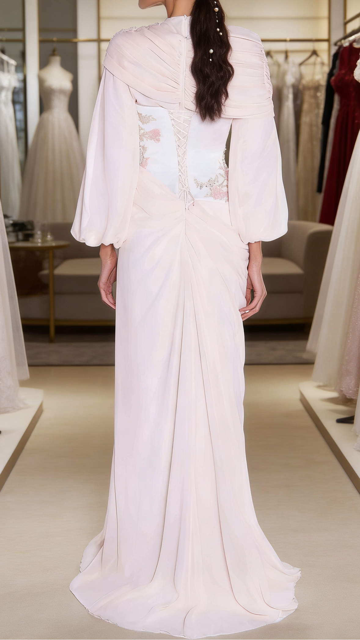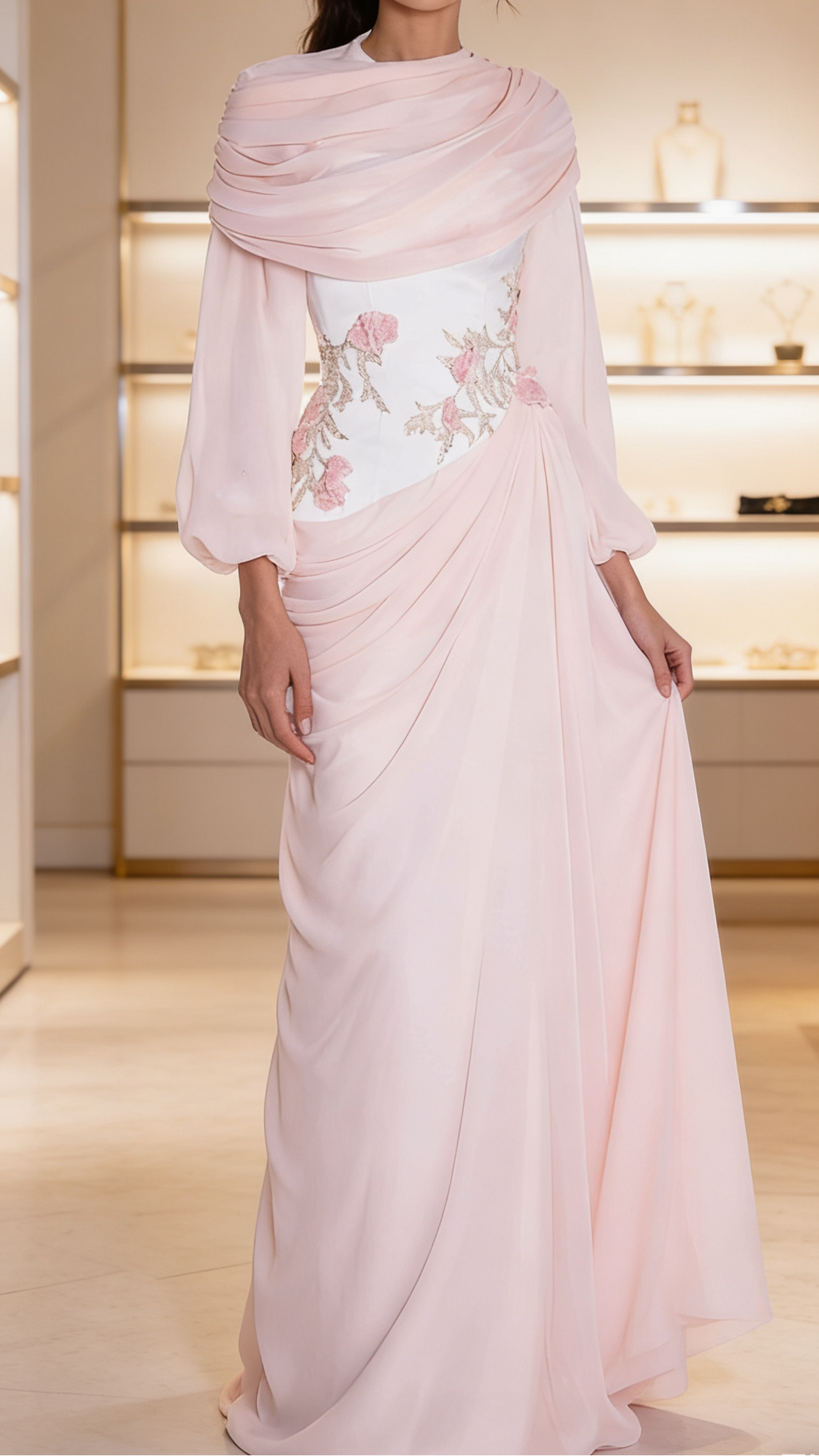 Elevate your evening presence with this sophisticated two-piece dress, designed for those who appreciate refined elegance. The scoop neckline and long sleeves provide graceful coverage, while sequined appliqués add a touch of glamour without overwhelming the silhouette. Crafted from flowing chiffon with strategic pleating, this fitted design flatters the figure and moves with effortless grace. Perfect for formal events, galas, or upscale celebrations where understated luxury speaks volumes. The two-piece construction offers versatility and a modern twist on classic evening wear.