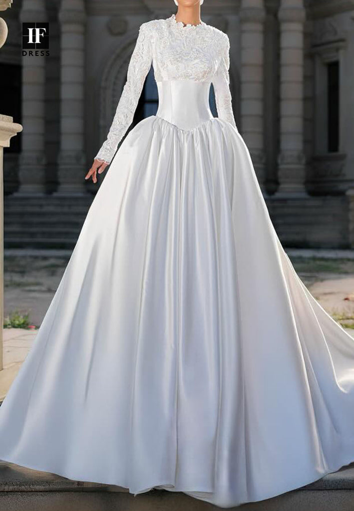 Scoop-Neck Long-Sleeves Lace Applique Pleated Satin Long A-Line Wedding Dress with Train