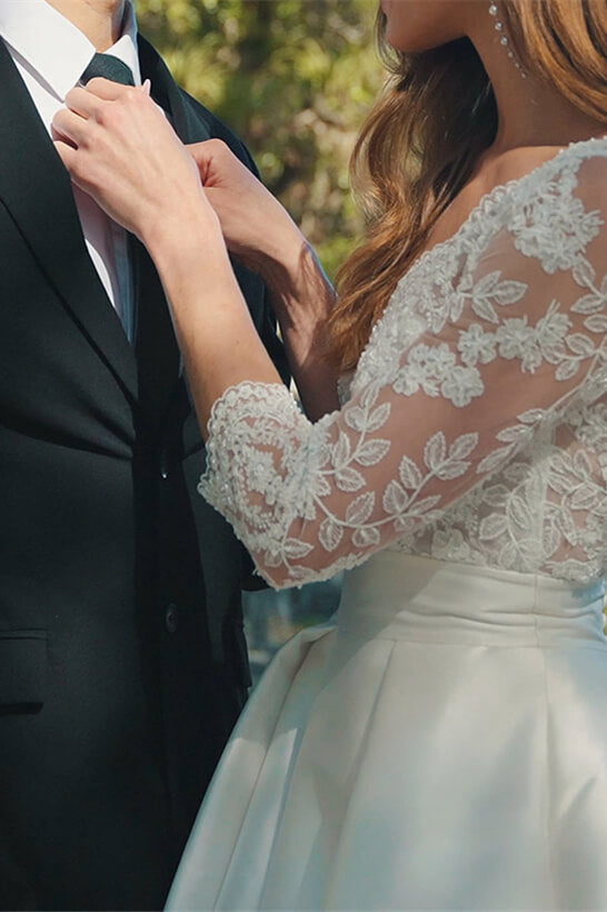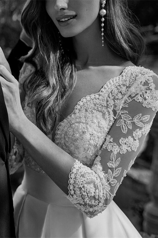 Make a stunning entrance in this sophisticated wedding dress, expertly crafted to celebrate your special day. The plunging V-neckline and graceful long sleeves create an elegant silhouette, while intricate beaded appliqués add luxurious detail and dimension. Constructed from premium satin, the dress features beautifully tailored pleats that flow into a flattering A-line skirt, offering both movement and timeless elegance. This refined design balances modern glamour with classic bridal sophistication, ensuring you feel confident and radiant as you walk down the aisle.
