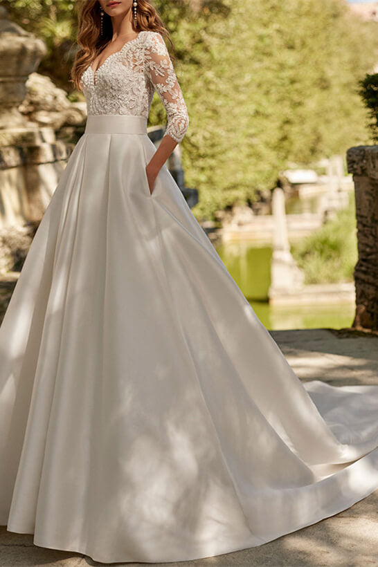 Deep V-Neck 3/4-Sleeves Beaded Applique Satin Pleated A-Line Wedding Dress