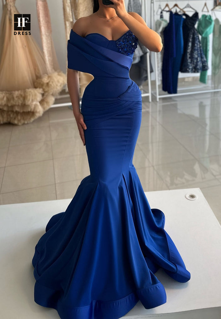Asymmetrical-Neck Sleeveless Beaded Mermaid Prom Dress Off-Shoulder Pleated Evening Gowns