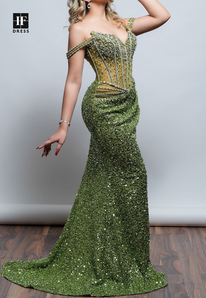 Off-Shoulder Sweetheart Mermaid Prom Dress Sleeveless Fully Sequined Pearls Party Gowns