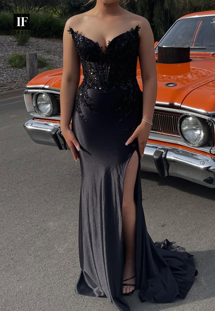 Sweetheart Sleeveless Beaded Mermaid Satin Long Formal Prom Dress with Slit
