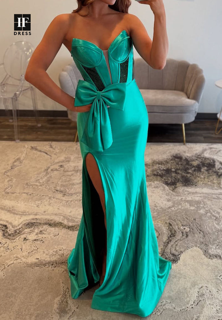 Off-Shoulder Sweetheart Sleeveless Party Gowns Beaded Satin Slit Mermaid Prom Dress with Bow