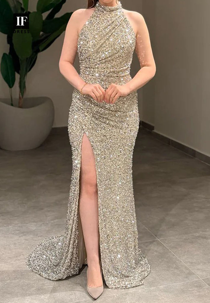 Halter-Neck Off-Shoulder Sleeveless Party Gowns Fully Sequined High Slit Mermaid Prom Dress
