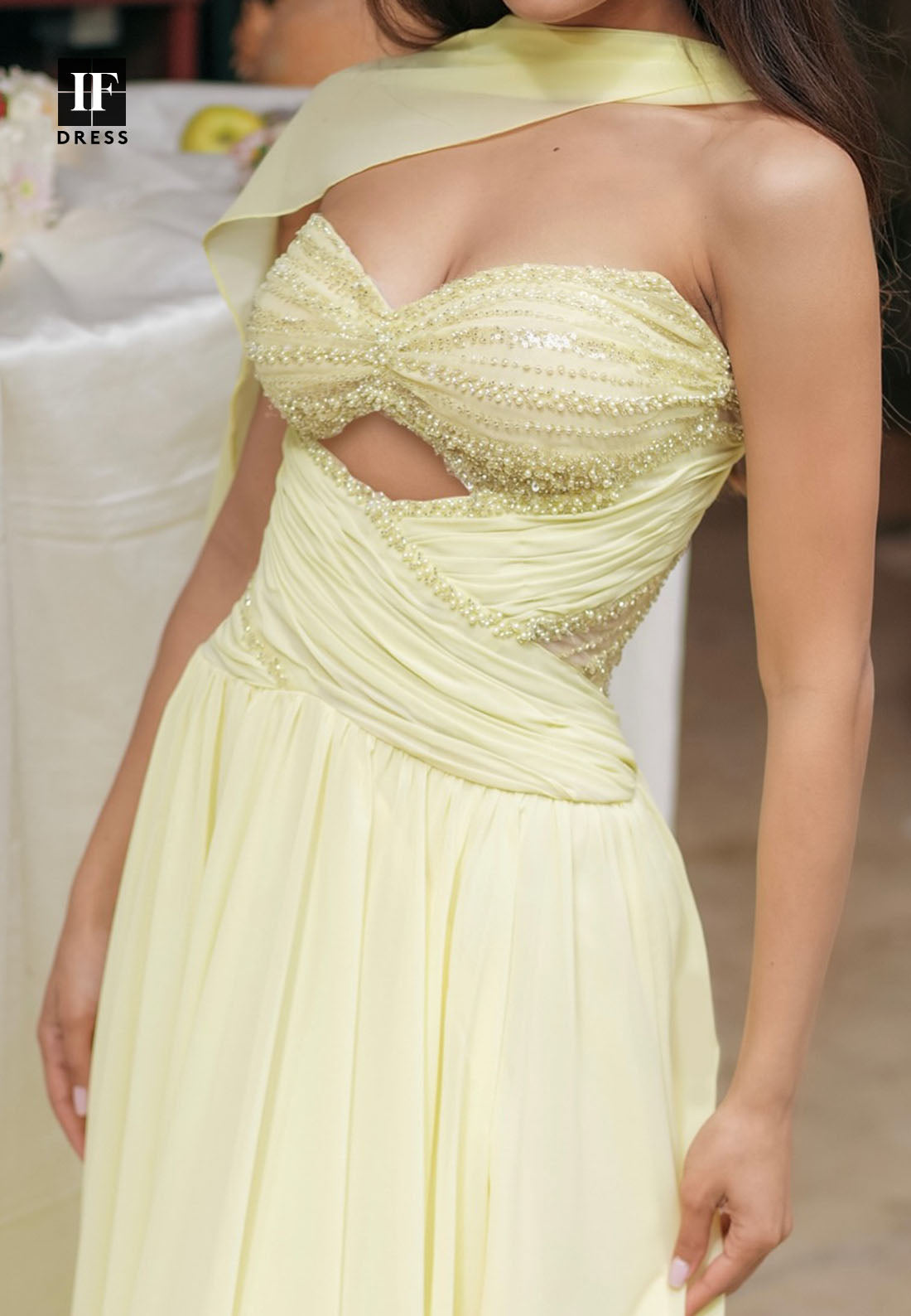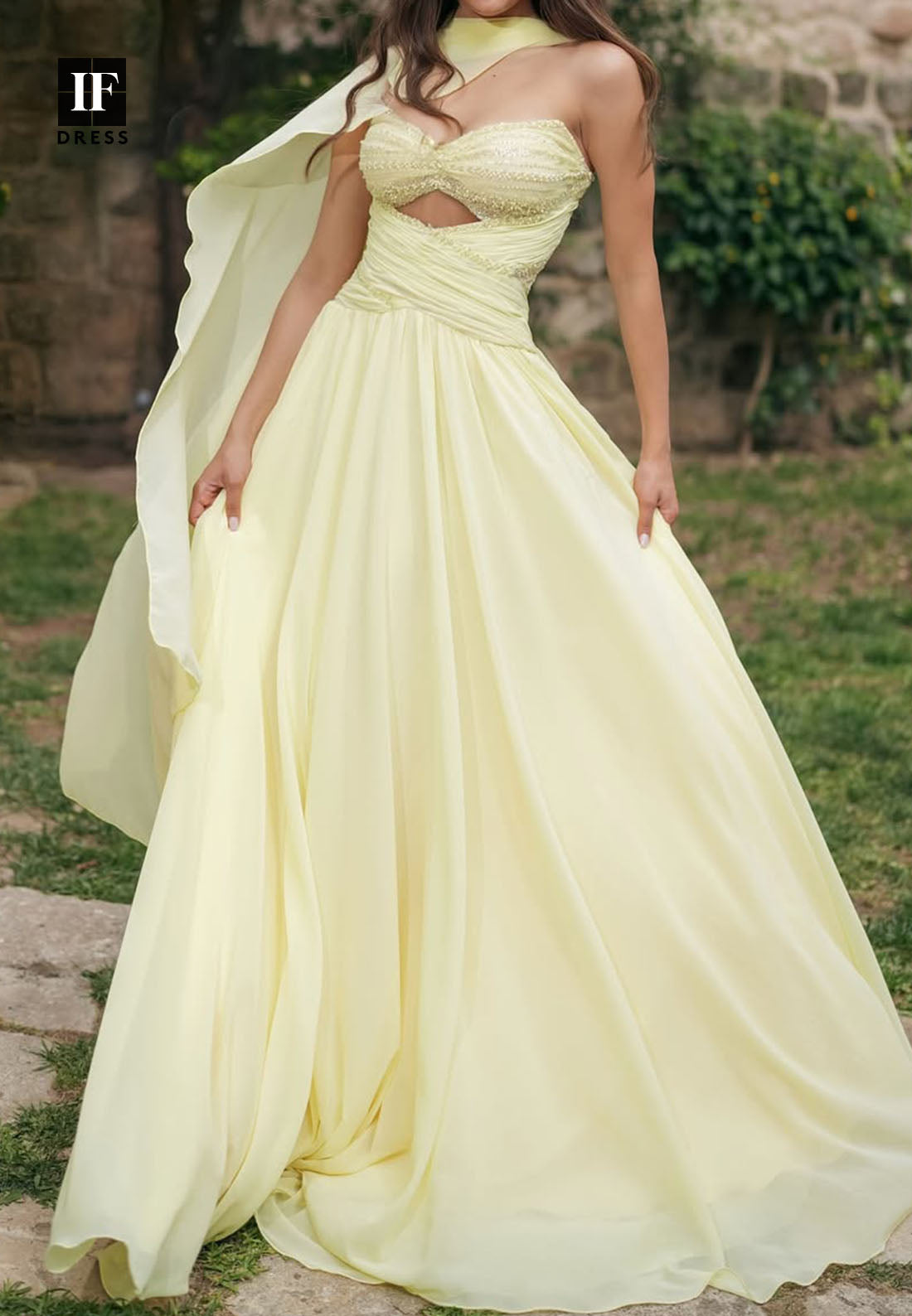 A-Line Off-Shoulder Sleeveless Beaded Formal Gowns Sweetheart Pleated Chiffon Evening Dress - Daffodil está en espera y se enviará tan pronto como vuelva a estar en stock