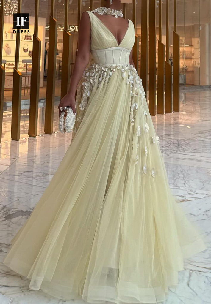 Deep V-Neck Straps Sleeveless A-Line Prom Dress Floral Embellished Pleated Tulle Party Gowns