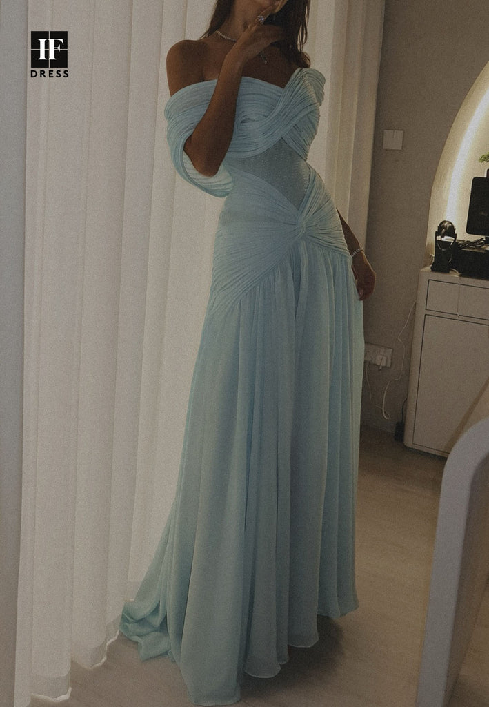 V-Neck Floor-Length Pleated Chiffon Party Gowns Off-Shoulder Sleeveless A-Line Prom Dress