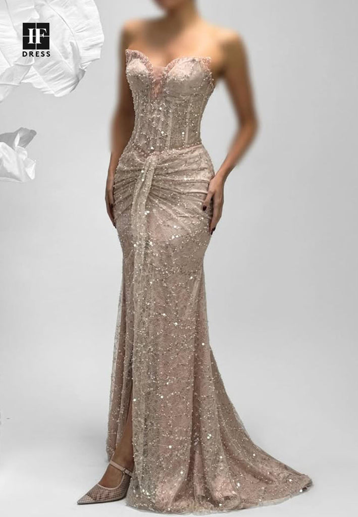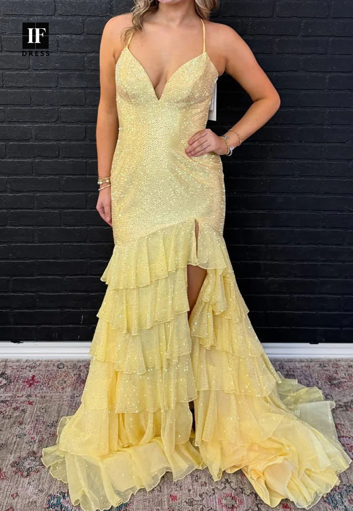 Deep V-Neck Spaghetti Straps Party Gowns Sleeveless Fully Sequined Beaded Mermaid Prom Dress