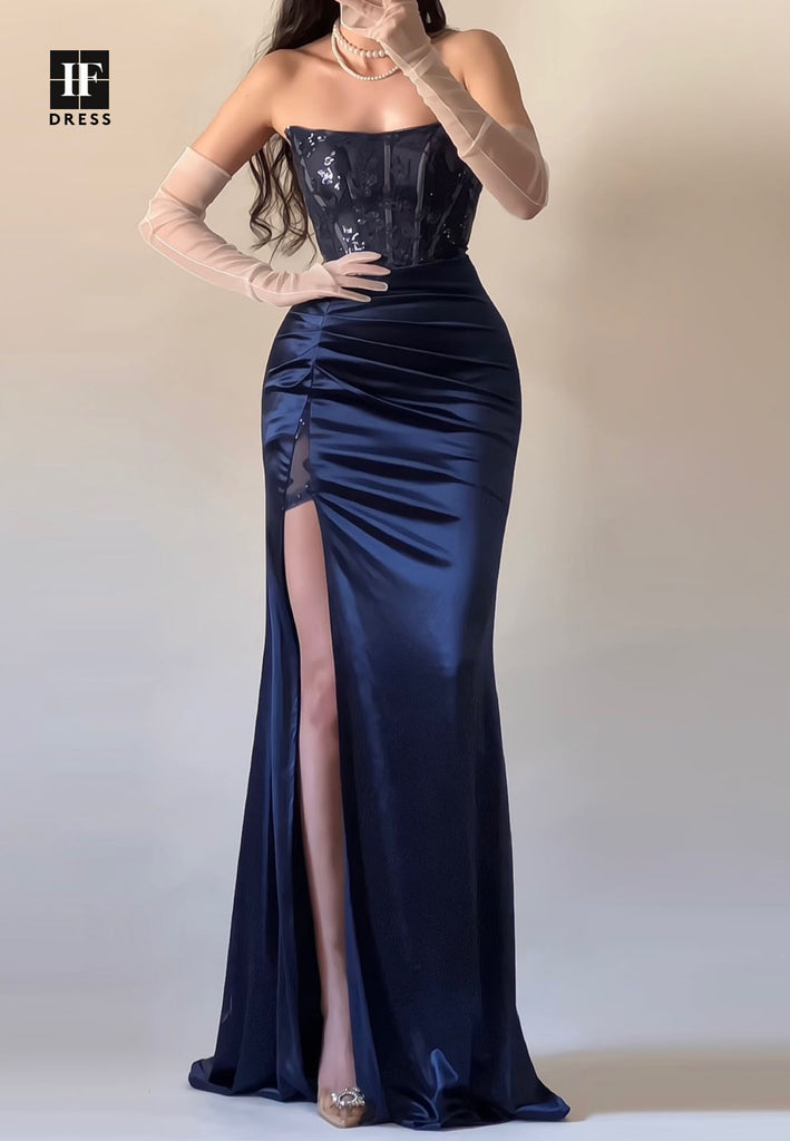 Turn heads in this contemporary mermaid prom dress featuring a chic tube top design that showcases clean, modern lines. The sleeveless silhouette highlights the bodice's expertly pleated satin, which creates refined texture and visual interest. Sequined appliqués add strategic sparkle and dimension without overwhelming the design. Luxurious satin fabric drapes flawlessly while a daring high slit provides modern movement and contemporary edge. The mermaid cut hugs gracefully before sweeping to the floor for dramatic impact. Perfect for prom, formal celebrations, and upscale evening events where you want to blend minimalist sophistication with bold, fashion-forward styling.