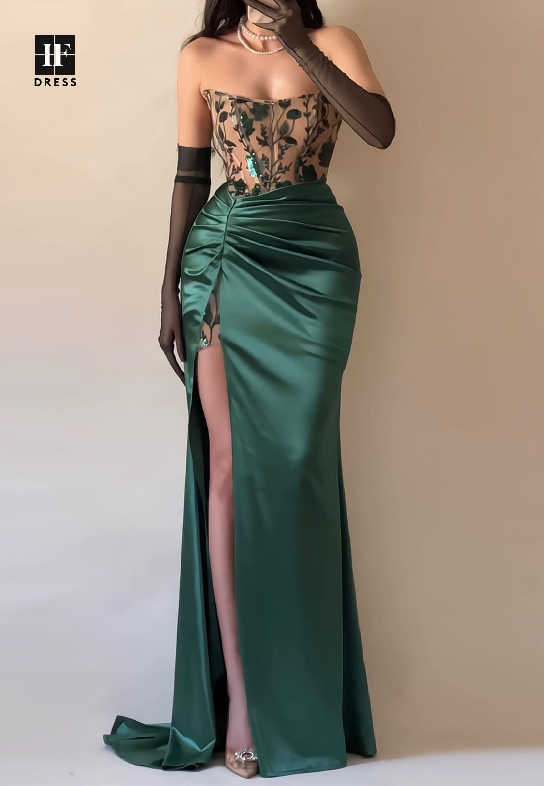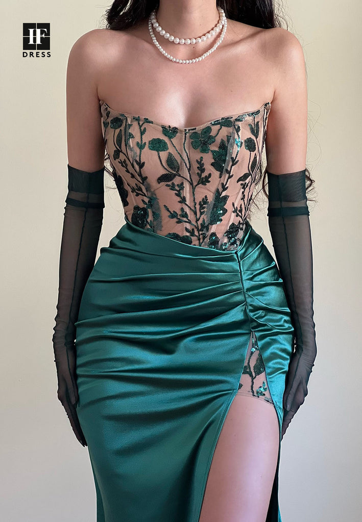 Tube Top Sleeveless Satin Pleated Party Gowns Sequined Applique High Slit Mermaid Prom Dress - Dark Green está en espera y se enviará tan pronto como vuelva a estar en stock
