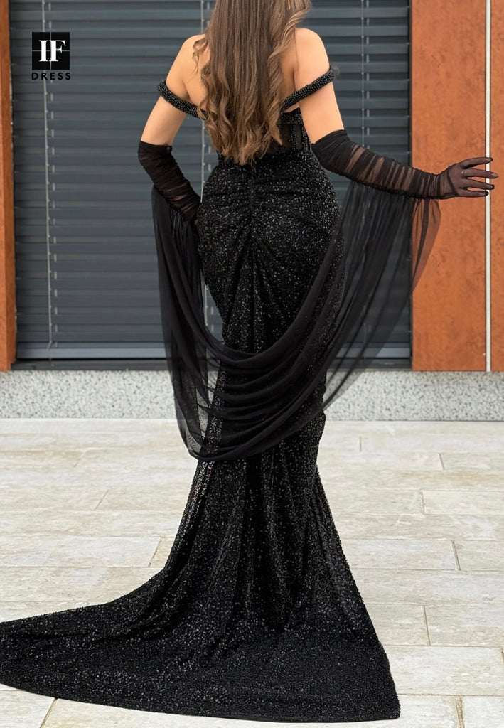 Sweetheart Sleeveless Pleated Fully Sequined Beaded Mermaid Evening Dress with Tulle Gloves - Black está en espera y se enviará tan pronto como vuelva a estar en stock