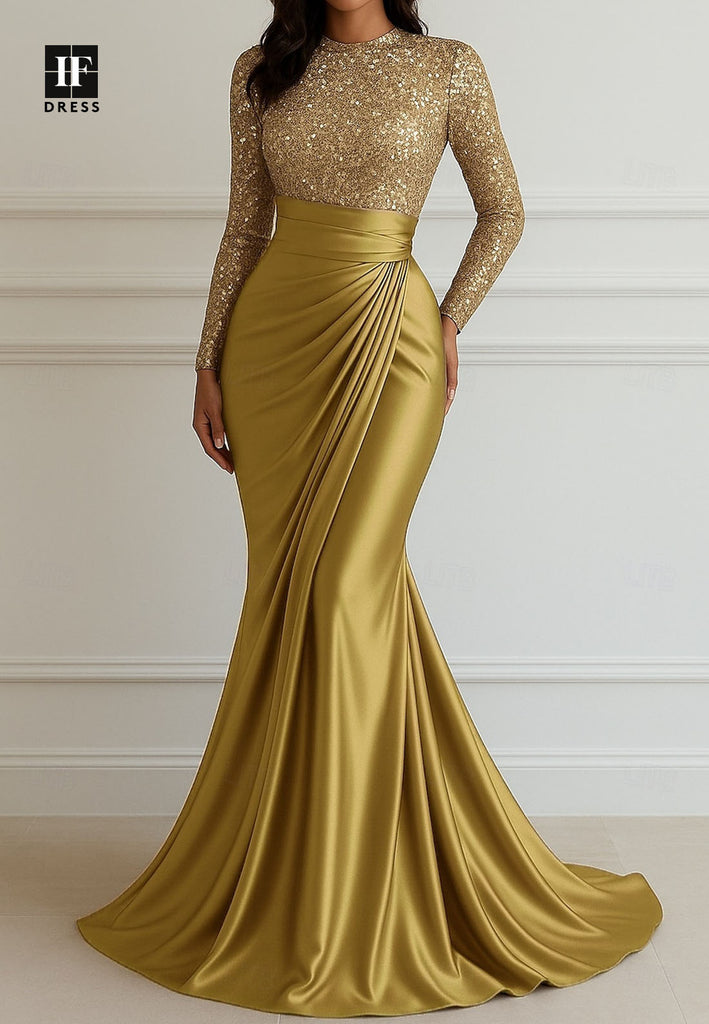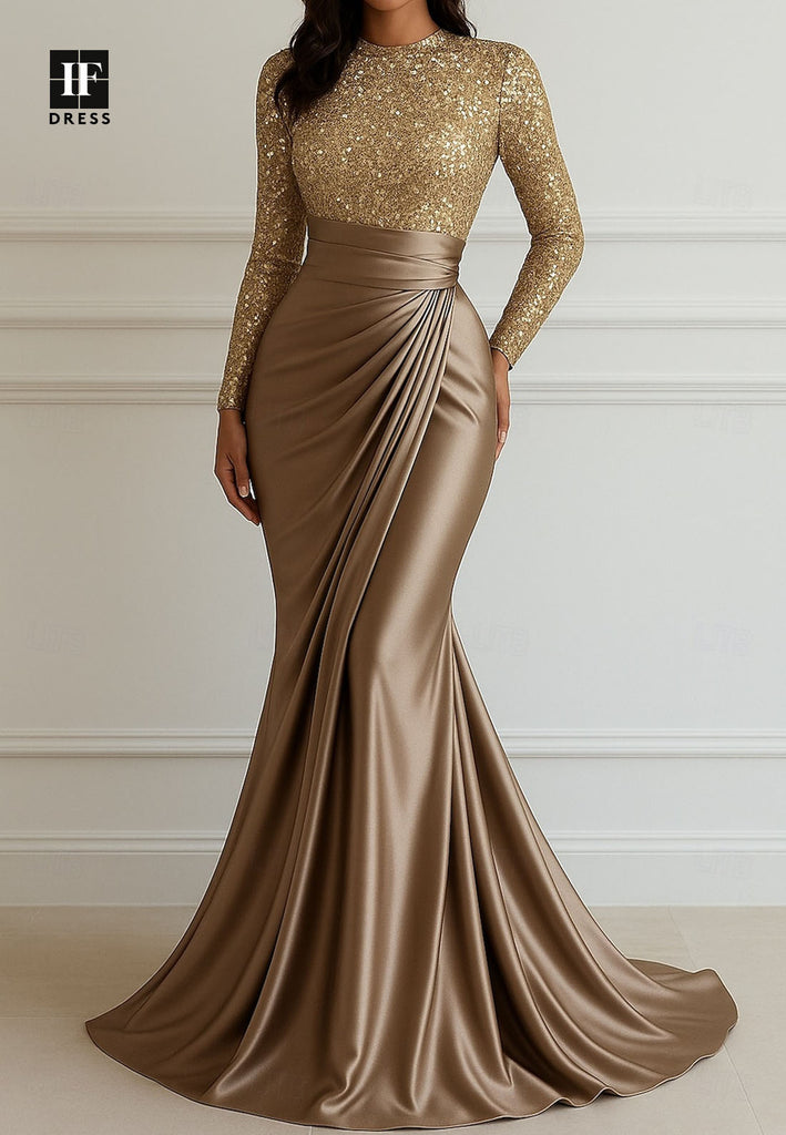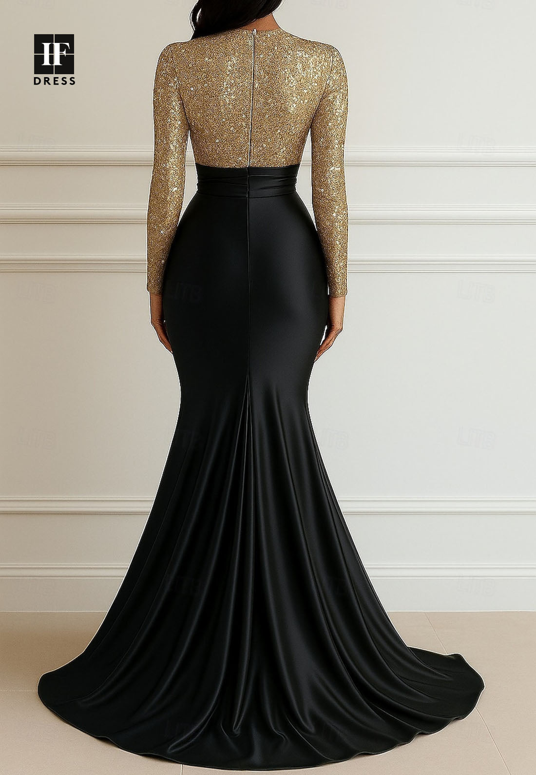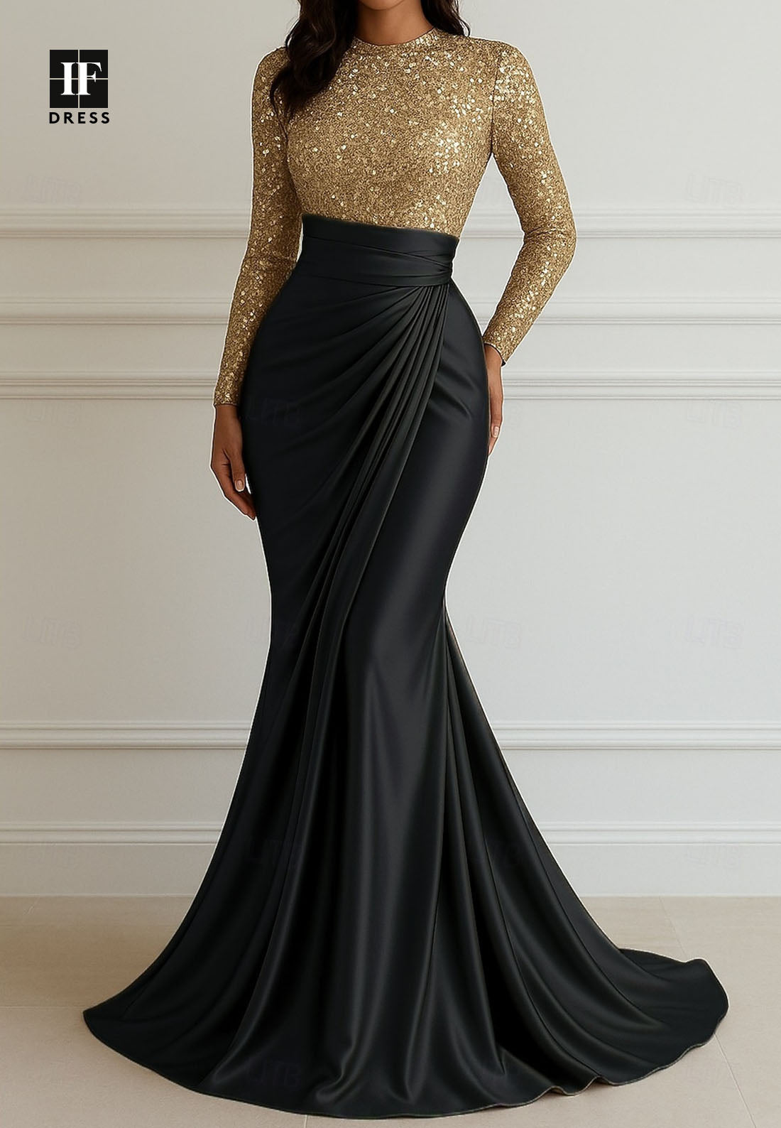 Scoop-Neck Long-Sleeves Mother of the Bride Gowns Sequined Pleated Satin Mermaid Evening Dress - Gold&Black está en espera y se enviará tan pronto como vuelva a estar en stock