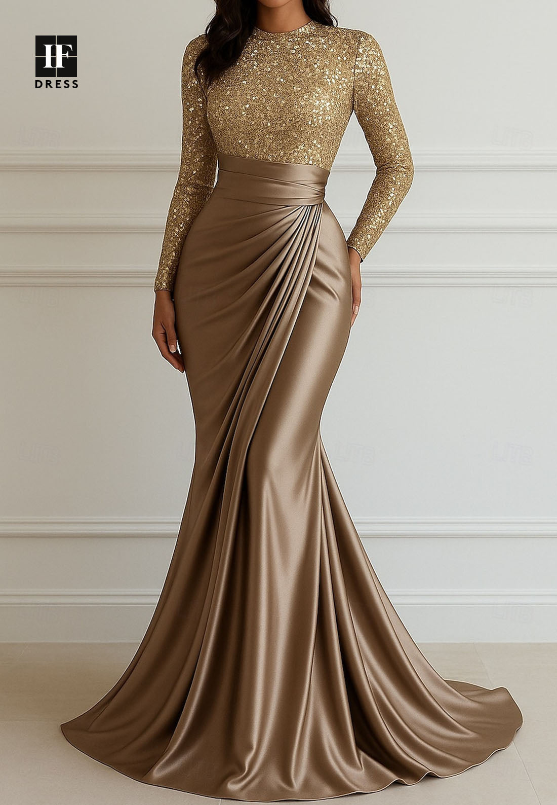 Command presence in this sophisticated mother of the bride gown featuring a graceful scoop neckline and elegant long sleeves. Luxurious pleated satin creates refined texture and movement, while full sequin coverage adds captivating sparkle and dimension. The mermaid silhouette hugs elegantly before sweeping dramatically to the floor, creating an unforgettable impression. Long sleeves provide timeless sophistication and refined coverage, while the scoop neckline offers a flattering, classic frame. The combination of pleated satin and sequin detailing ensures you radiate both elegance and glamour. Perfect for weddings, formal celebrations, and special occasions where dignified beauty and polished sophistication are paramount.