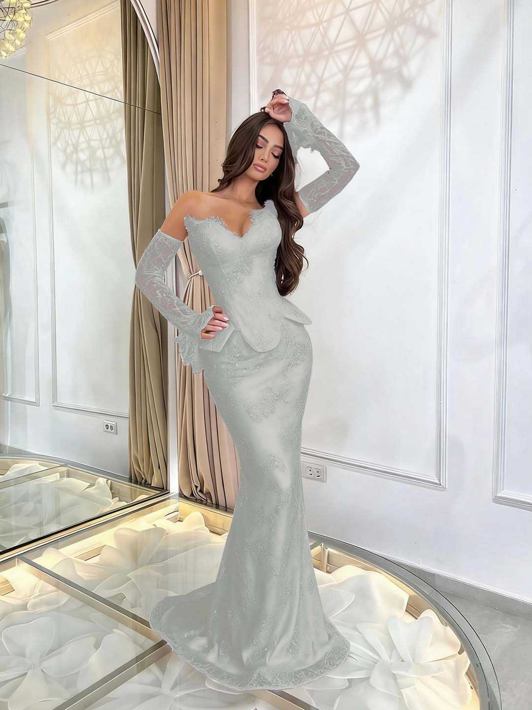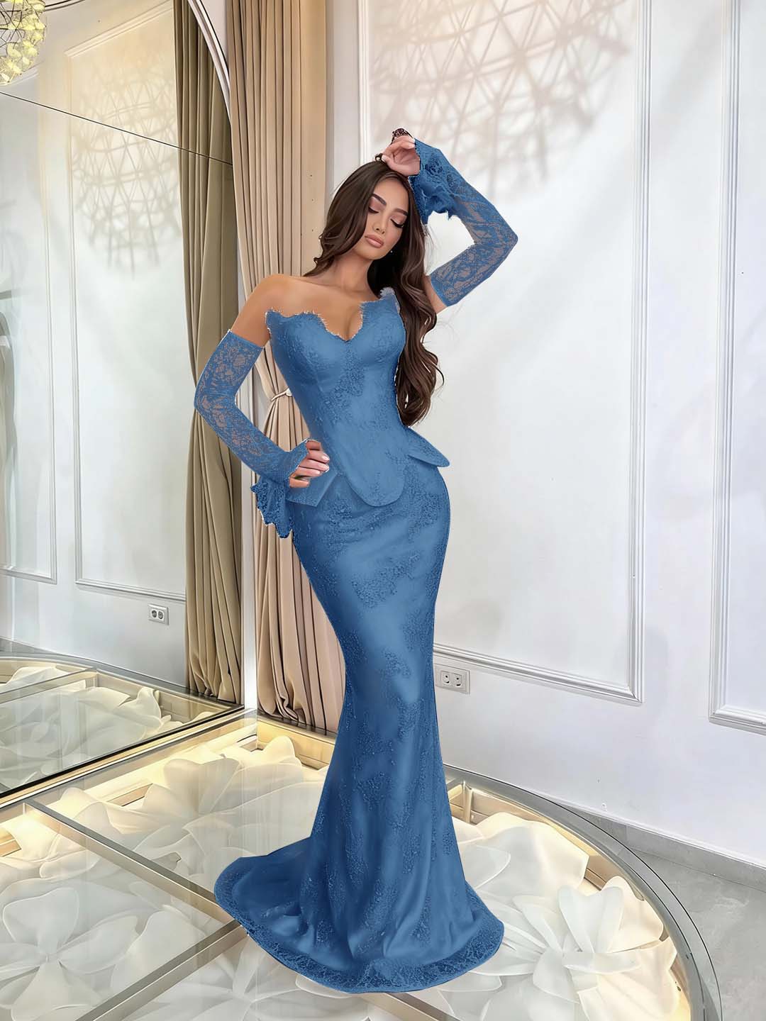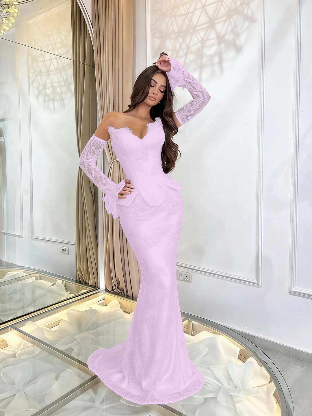 Make a stunning entrance in this sophisticated mermaid prom dress, designed to captivate from every angle. The sweetheart neckline and off-shoulder long sleeves create an elegant, timeless silhouette, while the fully sequined lace bodice catches light beautifully throughout the evening. The fitted mermaid cut flows gracefully to a floor-length hem, offering both drama and refined elegance. Perfect for prom, formal galas, or black-tie events, this dress combines intricate beadwork with flattering construction for an unforgettable look.