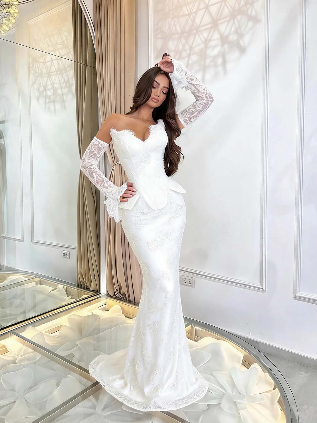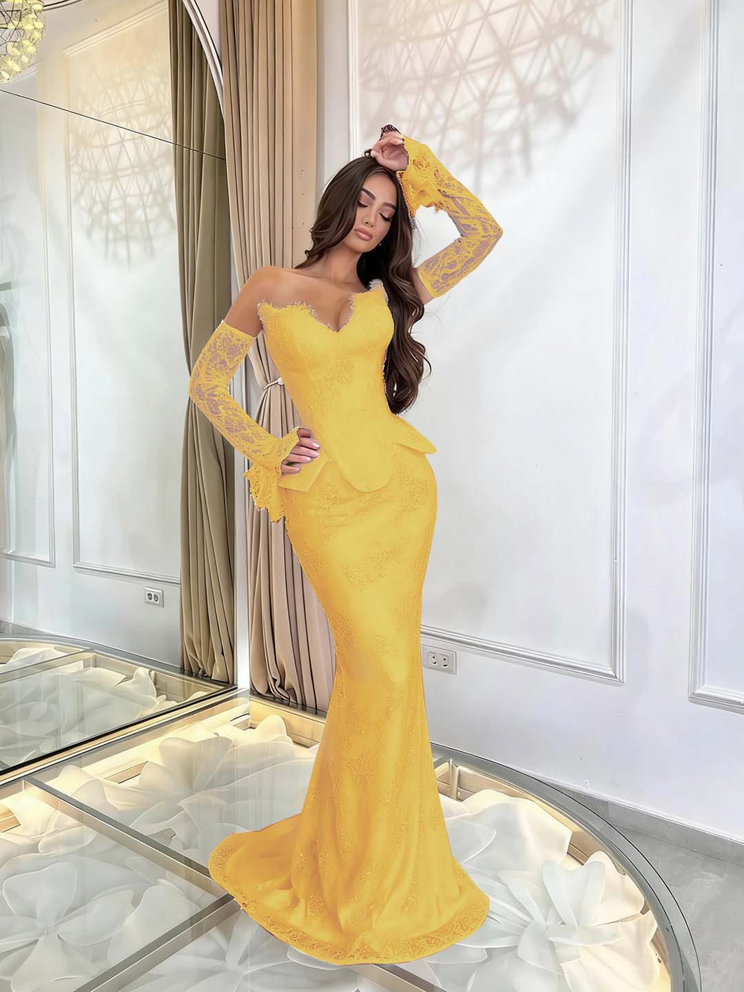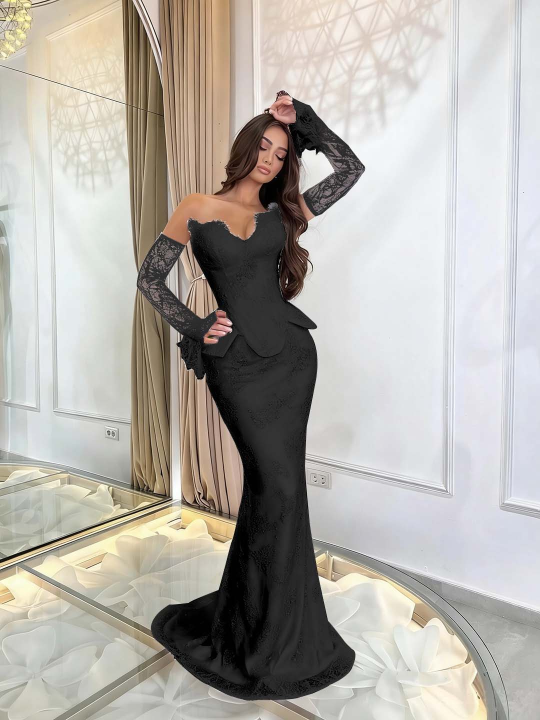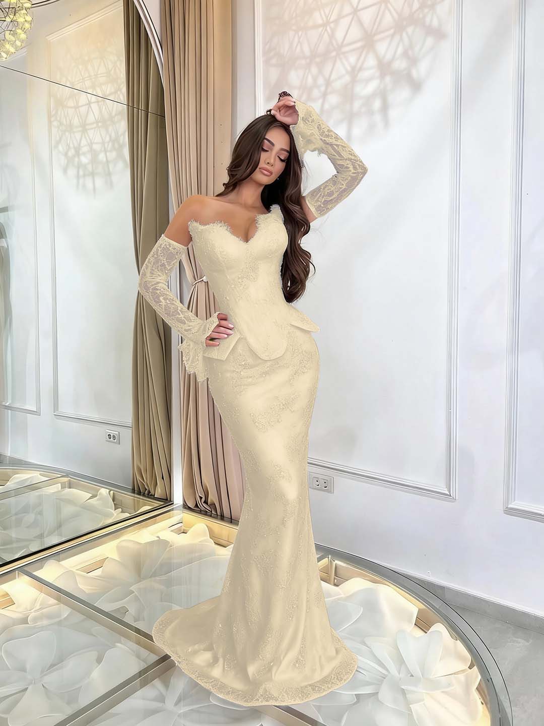 Make a stunning entrance in this sophisticated mermaid prom dress, designed to captivate from every angle. The sweetheart neckline and off-shoulder long sleeves create an elegant, timeless silhouette, while the fully sequined lace bodice catches light beautifully throughout the evening. The fitted mermaid cut flows gracefully to a floor-length hem, offering both drama and refined elegance. Perfect for prom, formal galas, or black-tie events, this dress combines intricate beadwork with flattering construction for an unforgettable look.