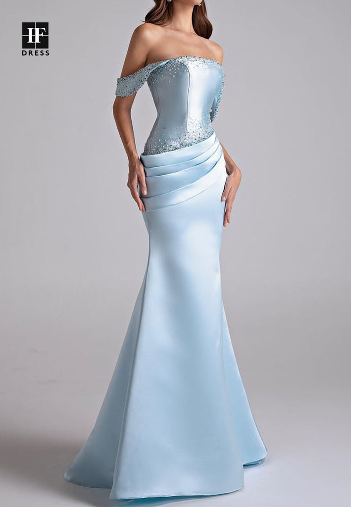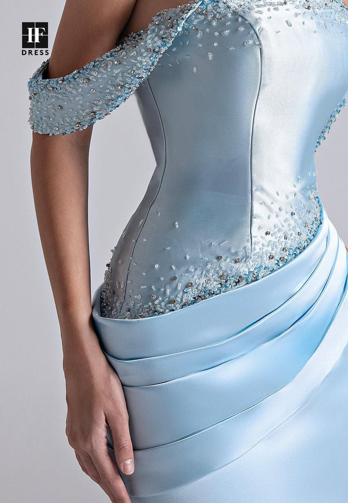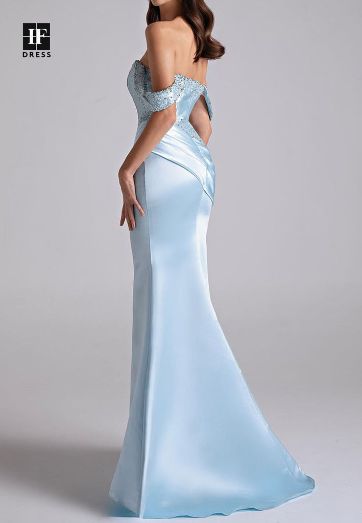 This mermaid evening dress features a sophisticated tube top with off-shoulder sleeves, combining modern elegance with timeless appeal. Crafted from pleated satin and adorned with delicate beadwork, it highlights the silhouette with a fitted design that flares gracefully at the hem. The sleeveless cut enhances freedom of movement, making it an ideal choice for formal events and prom nights demanding both style and poise.