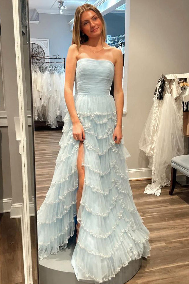 Tube Top Sleeveless Tulle Pleated Ruffled Tiered A-Line Prom Dress with High Slit - Light Blue est en rupture de stock et sera envoyé dès qu'il sera disponible