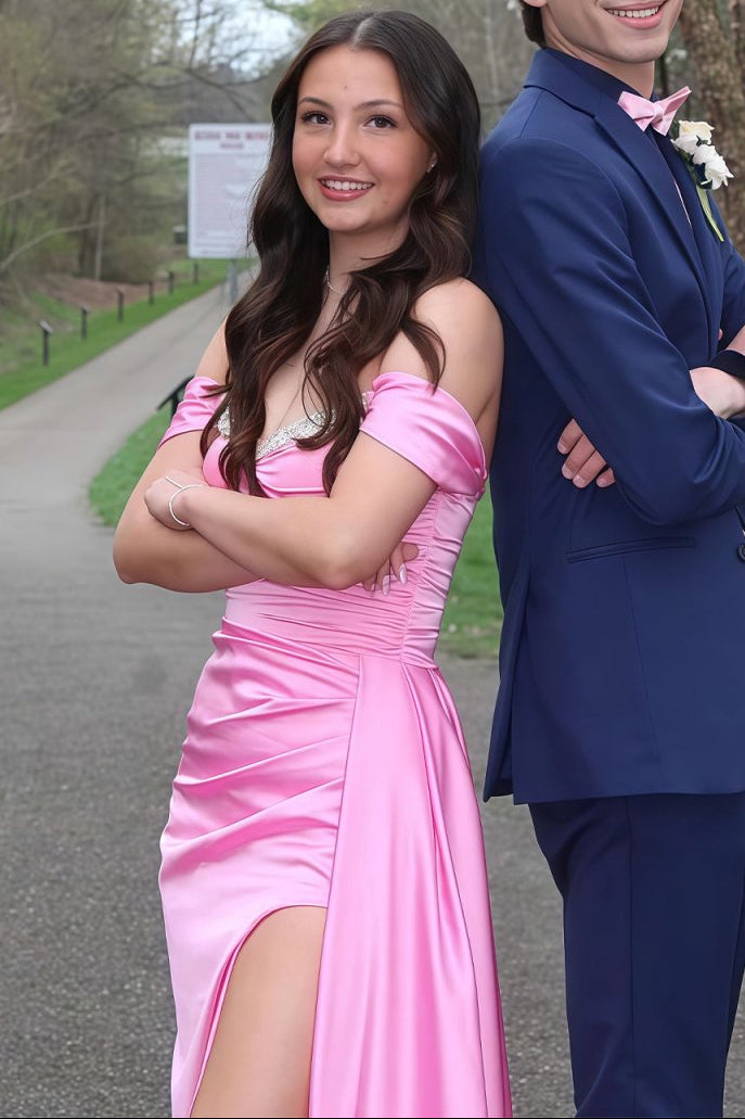 Sweetheart Off-Shoulder Beaded Floor-Length Satin Pleated Mermaid Prom Dress with Slit