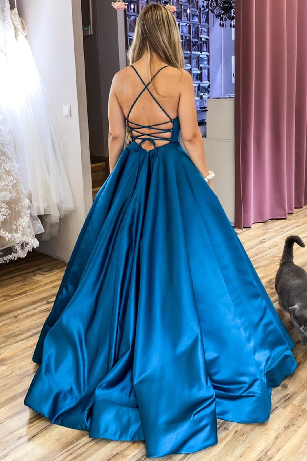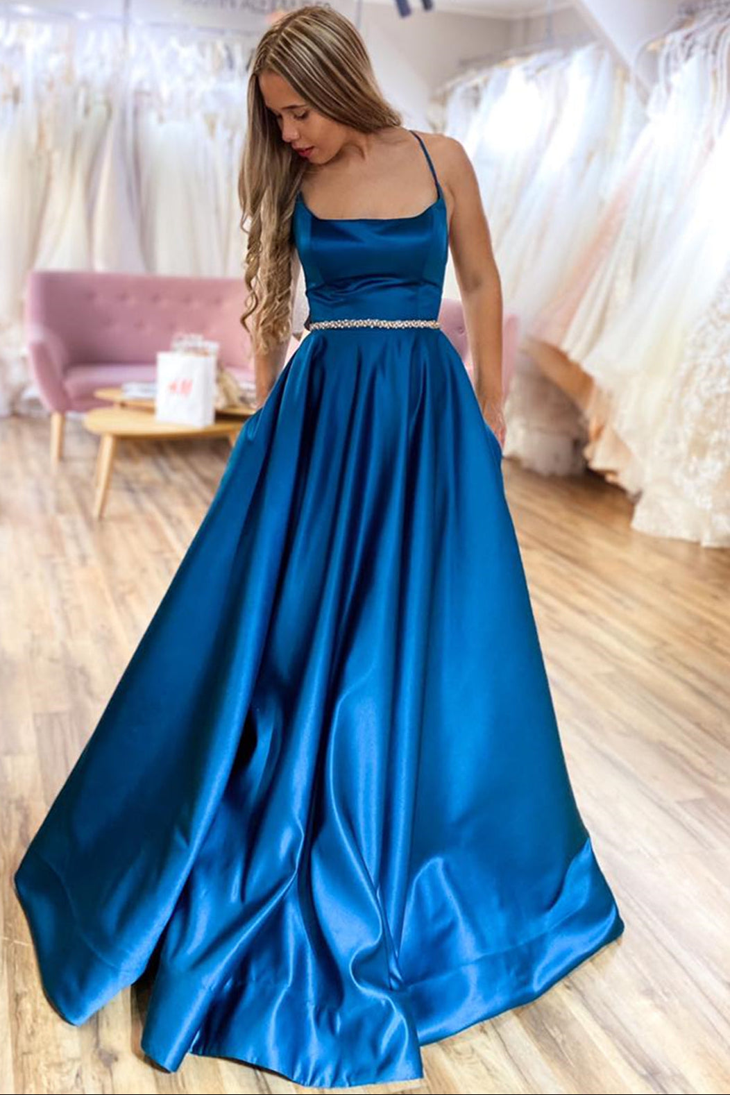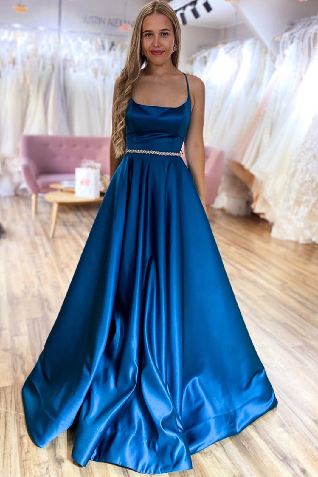 Elevate your prom night with this sophisticated satin gown featuring an elegant bateau neckline and delicate spaghetti straps. The bodice showcases intricate beading that catches the light beautifully, while the pleated A-line silhouette flatters every figure. A graceful sweep train adds dramatic flair as you move across the dance floor. Crafted from luxurious satin fabric, this dress combines timeless elegance with modern design details, ensuring you'll feel confident and radiant throughout the evening.