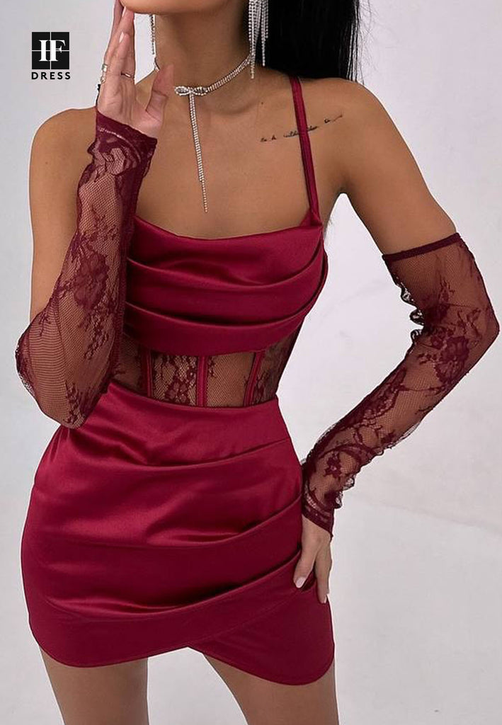 Scoop-Neck Spaghetti Straps Sleeveless Pleated Satin&Lace Mermaid Party Homecoming Dress