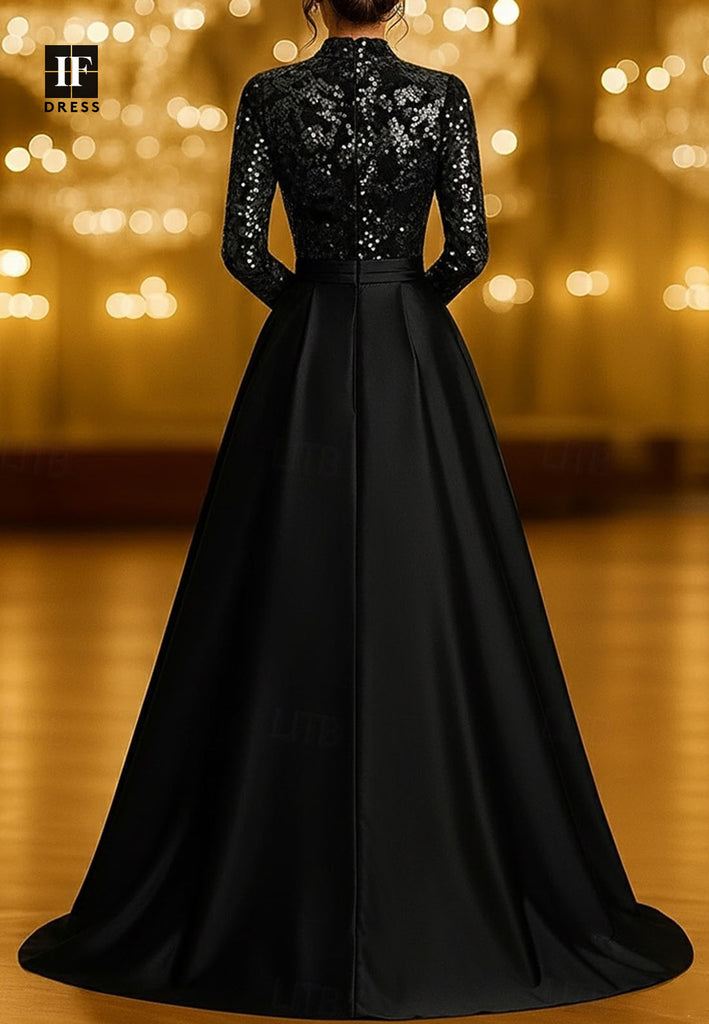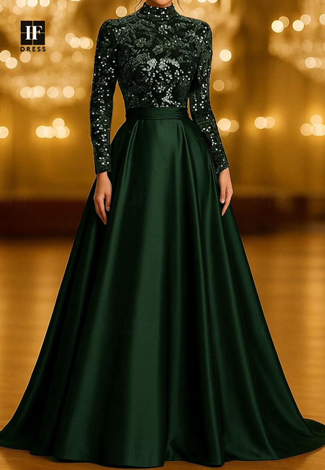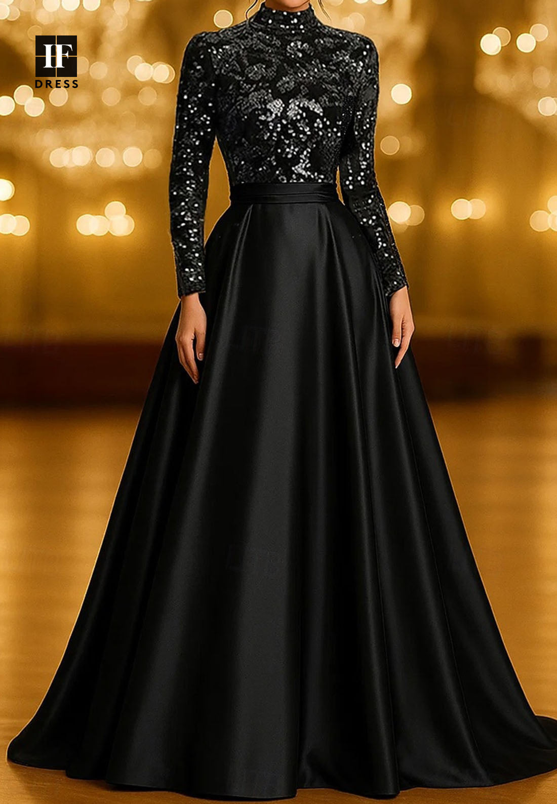 High-Neck Long-Sleeves A-Line Evening Dress Sequined Satin Floor-Length Formal Gowns