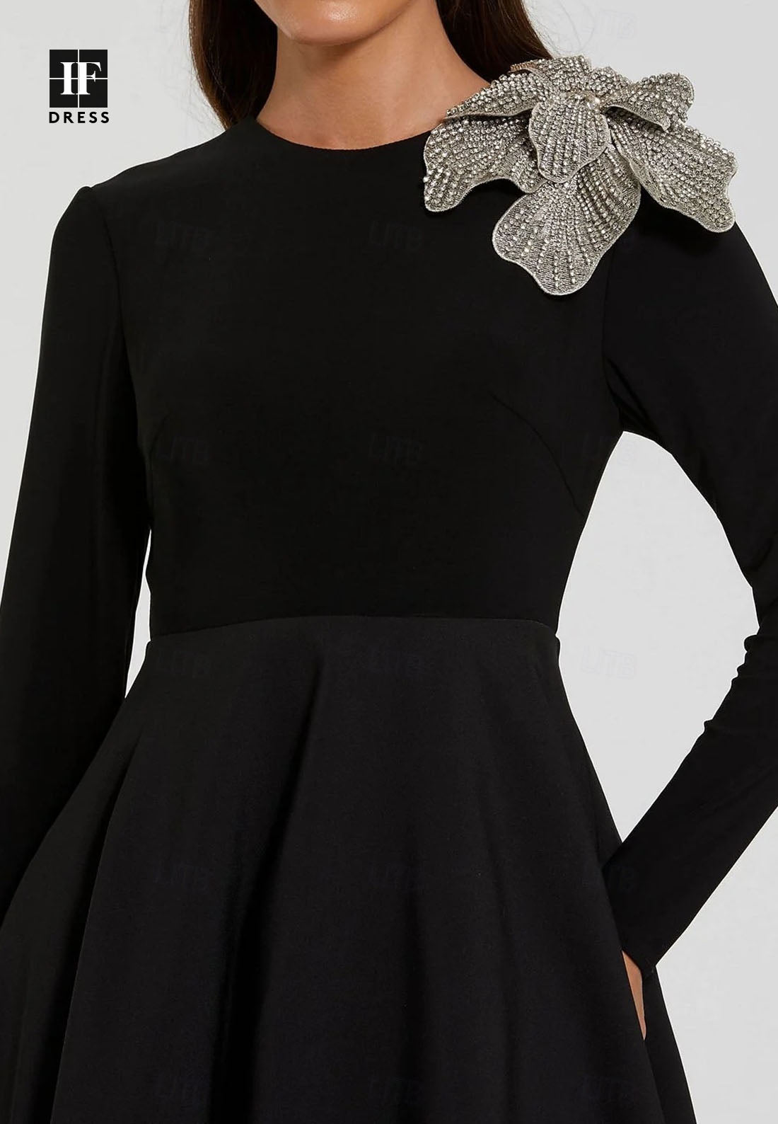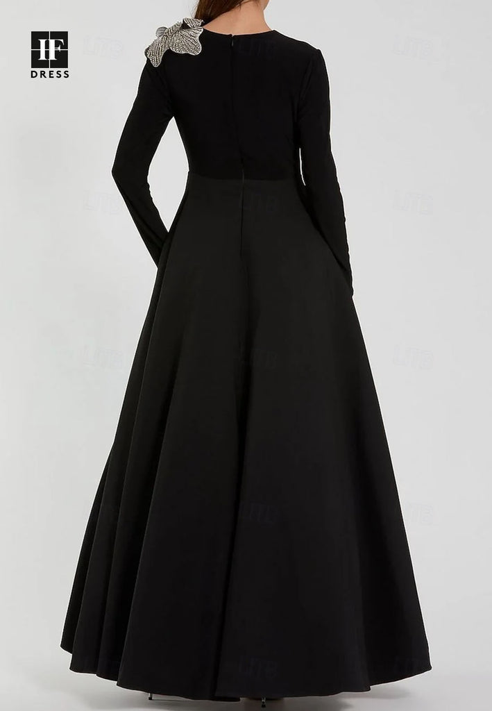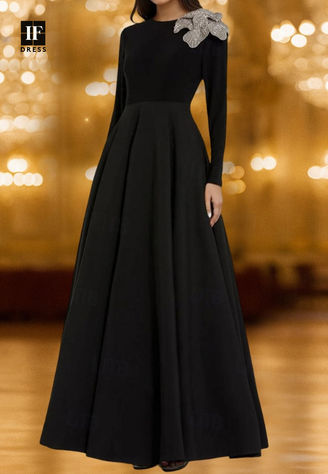 This exquisite evening dress combines timeless elegance with refined craftsmanship. The gentle scoop neckline and long sleeves provide graceful coverage, while luxurious satin fabric creates a fluid, flattering drape. Intricate beaded and floral embellishments adorn the bodice and skirt, adding dimensional artistry and visual interest. The A-line silhouette flows beautifully to the floor, creating an elongated, statuesque effect. Ideal for formal galas, upscale celebrations, and prestigious occasions, this gown delivers sophisticated glamour with understated luxury.