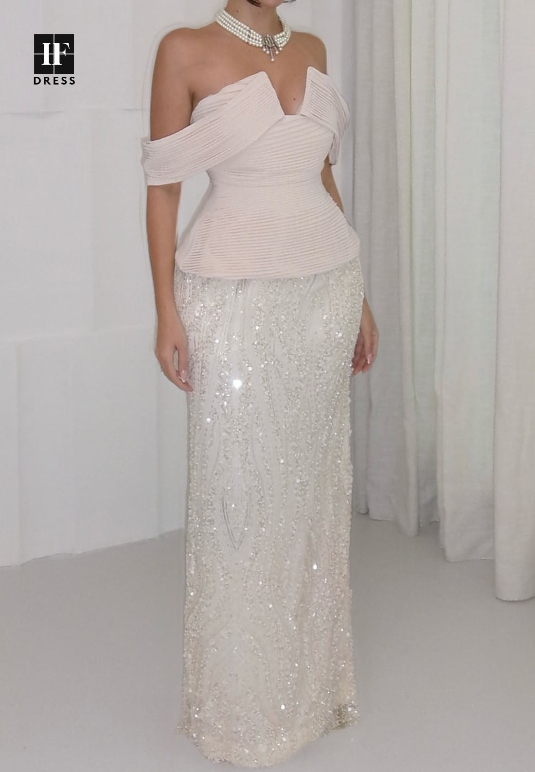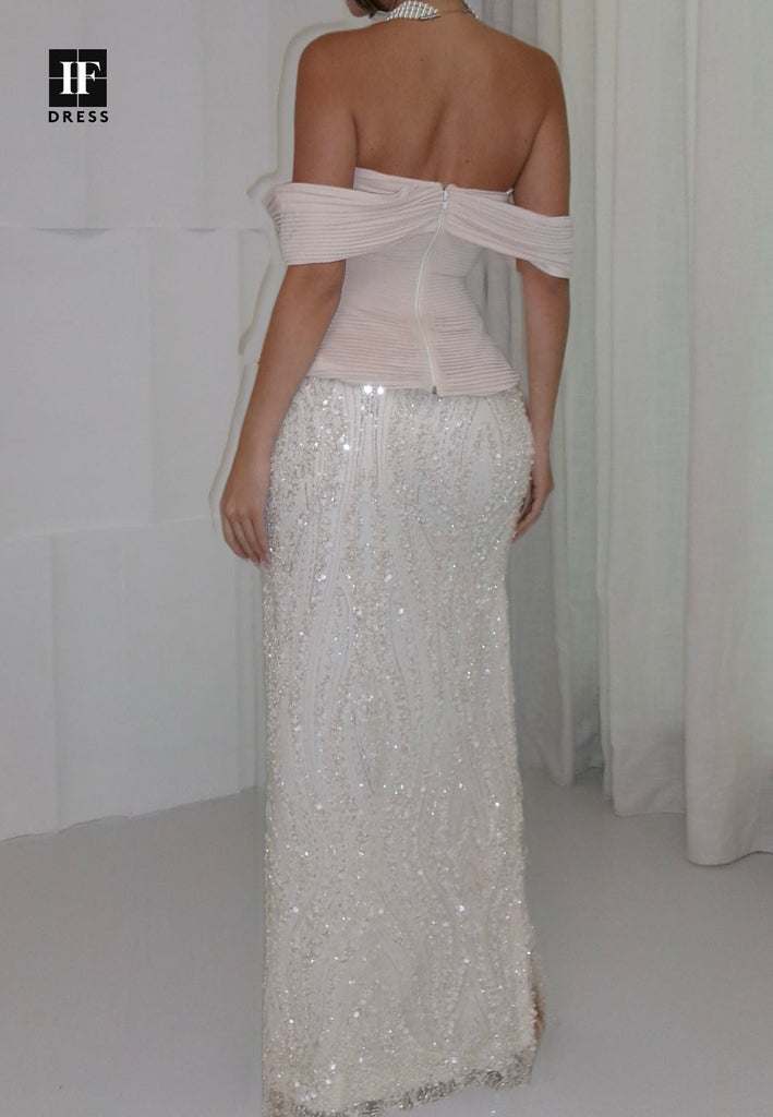 This sophisticated evening dress commands attention with its refined silhouette and exquisite detailing. The V-neckline and off-shoulder design create a flattering, contemporary look that balances elegance with allure. Sequin and bead embellishments adorn the bodice, providing luxurious sparkle and visual interest. The premium satin fabric features strategic pleating that enhances the figure while ensuring graceful movement. The mermaid cut hugs the body through the hips before flowing into a dramatic floor-length train, delivering timeless glamour. Ideal for galas, formal dinners, and special occasions, this gown showcases impeccable craftsmanship and refined taste.