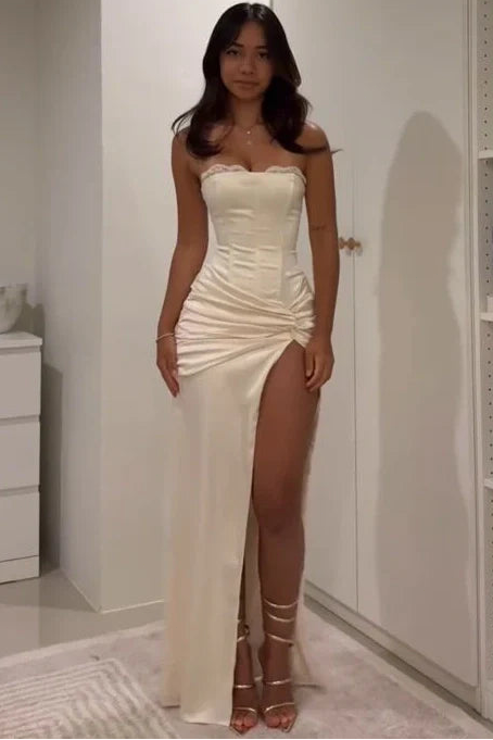 Sweetheart Sleeveless Satin Pleated Floor-length Mermaid Prom Dress with High Slit - White est en rupture de stock et sera envoyé dès qu'il sera disponible