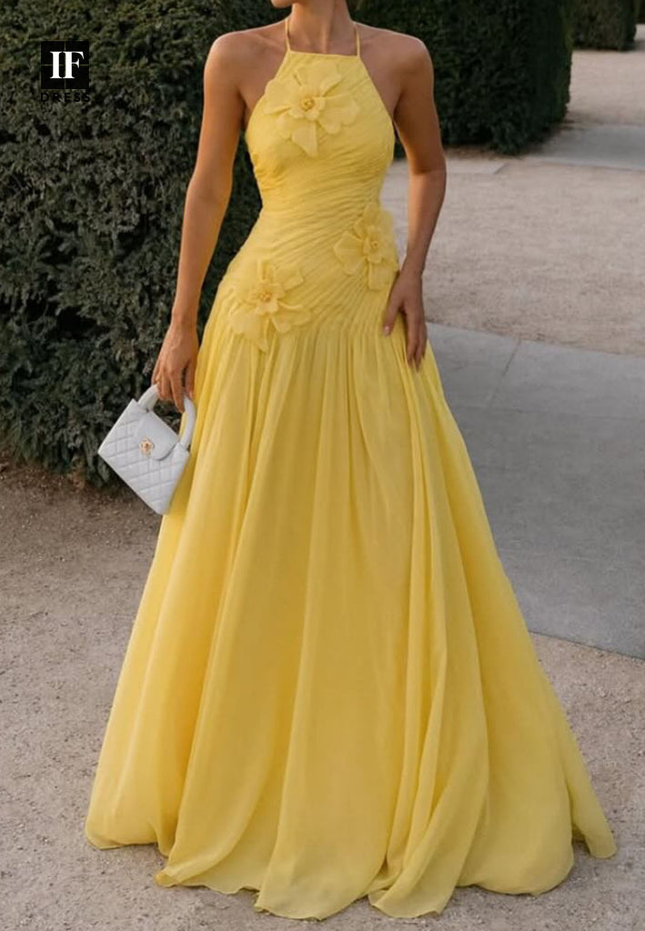 Halter-Neck Sleeveless Pleated Chiffon Formal Gowns Off-Shoulder Floral Embellished A-Line Evening Dress