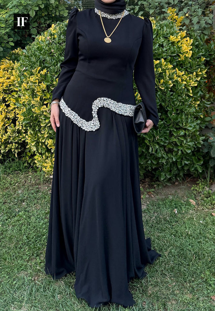 High-Neck Long-Sleeves Floor-Length Rhinestone Pleated Chiffon Meramid Evening Dress