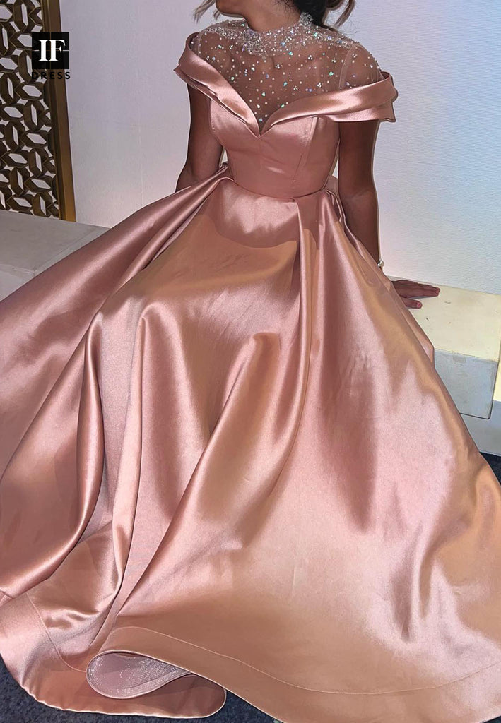 High-Neck Cap-Sleeves Satin A-Line Evening Dress Sequined Beaded Sheer Formal Gowns with Train