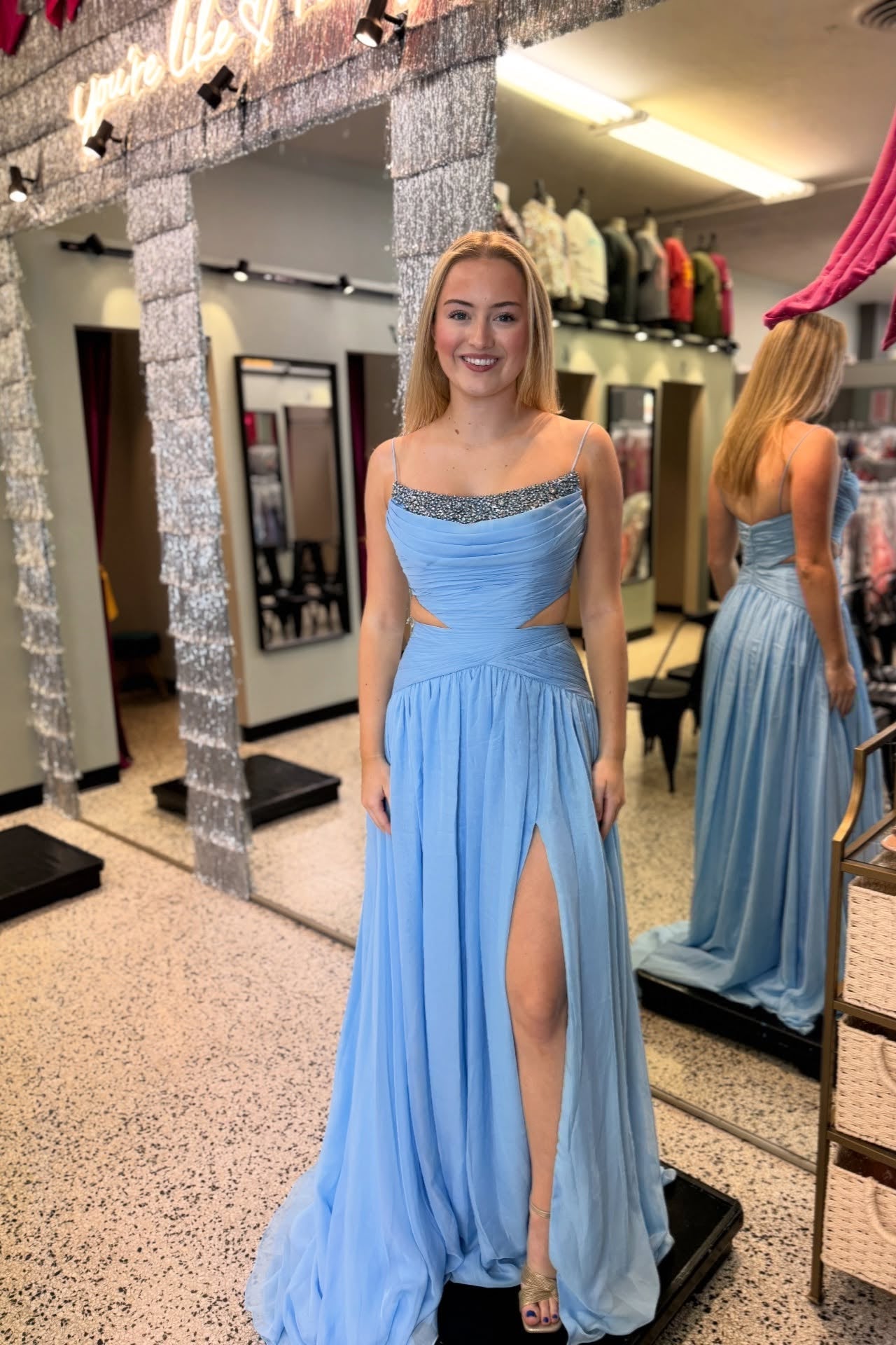 Elevate your prom night with this sophisticated A-line gown featuring an elegant scoop neckline and delicate spaghetti straps. The bodice showcases intricate beading that catches the light beautifully, while flowing chiffon fabric drapes gracefully from the pleated waist. The floor-length silhouette creates a timeless, flattering shape, and the subtle slit adds contemporary movement and ease. Perfect for making a refined statement at formal events, this dress combines classic elegance with modern design details for an unforgettable evening.