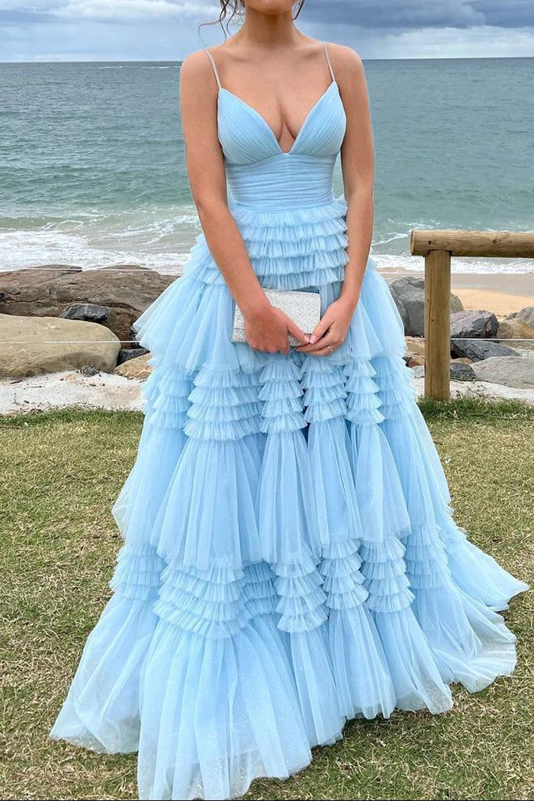 Deep V-Neck Spaghetti Straps Sleeveless Tulle Pleated Ruffled Tiered A-Line Prom Dress
