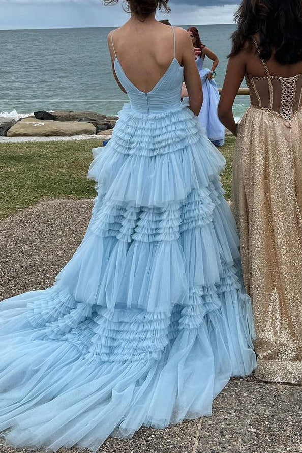 Deep V-Neck Spaghetti Straps Sleeveless Tulle Pleated Ruffled Tiered A-Line Prom Dress - Sky Blue est en rupture de stock et sera envoyé dès qu'il sera disponible