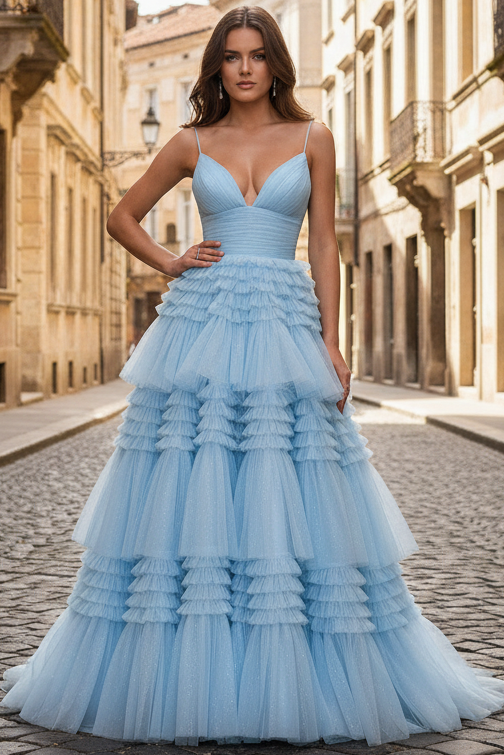 Make a stunning entrance in this sophisticated prom dress, designed to captivate. The deep V-neckline and delicate spaghetti straps create an elegant, flattering silhouette, while the sleeveless cut offers modern refinement. Layers of pleated and ruffled tulle cascade down the tiered skirt, building graceful movement and dimension with every step. The classic A-line cut provides a universally flattering shape that flatters all figures. Perfect for prom, formal galas, or any special occasion where you want to feel confident and radiant.