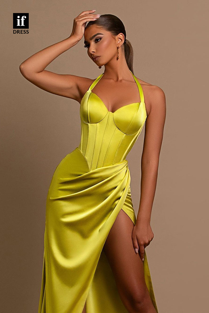 B5017 - Halter V-Neck Pleats Sheath Side Slit Long Bridesmaid Dress - As Pic is backordered and will ship as soon as it is back in stock.