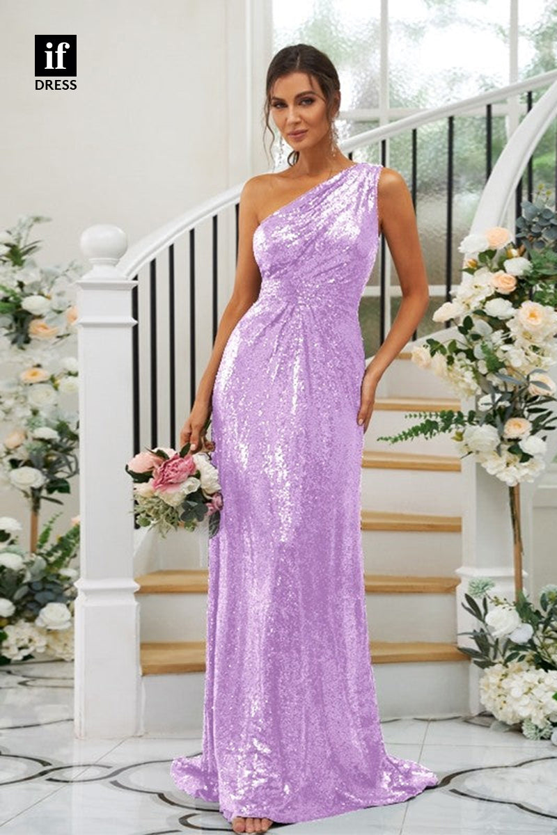 B5062 - Charming One Shoulder Ruched Sequined Long Bridesmaid Dress - As Pic is backordered and will ship as soon as it is back in stock.