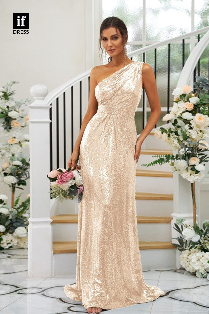 B5062 - Charming One Shoulder Ruched Sequined Long Bridesmaid Dress