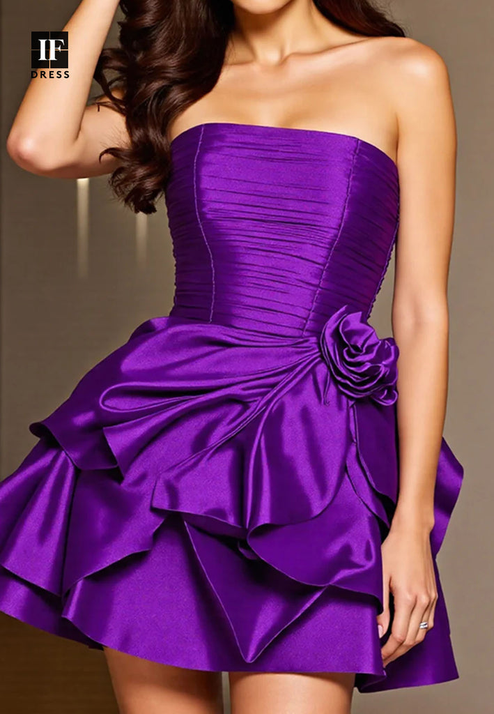 Tube Top Off-Shoulder Sleeveless Floral Embellished Pleated Satin Tiered A-Line Homecoming Dress