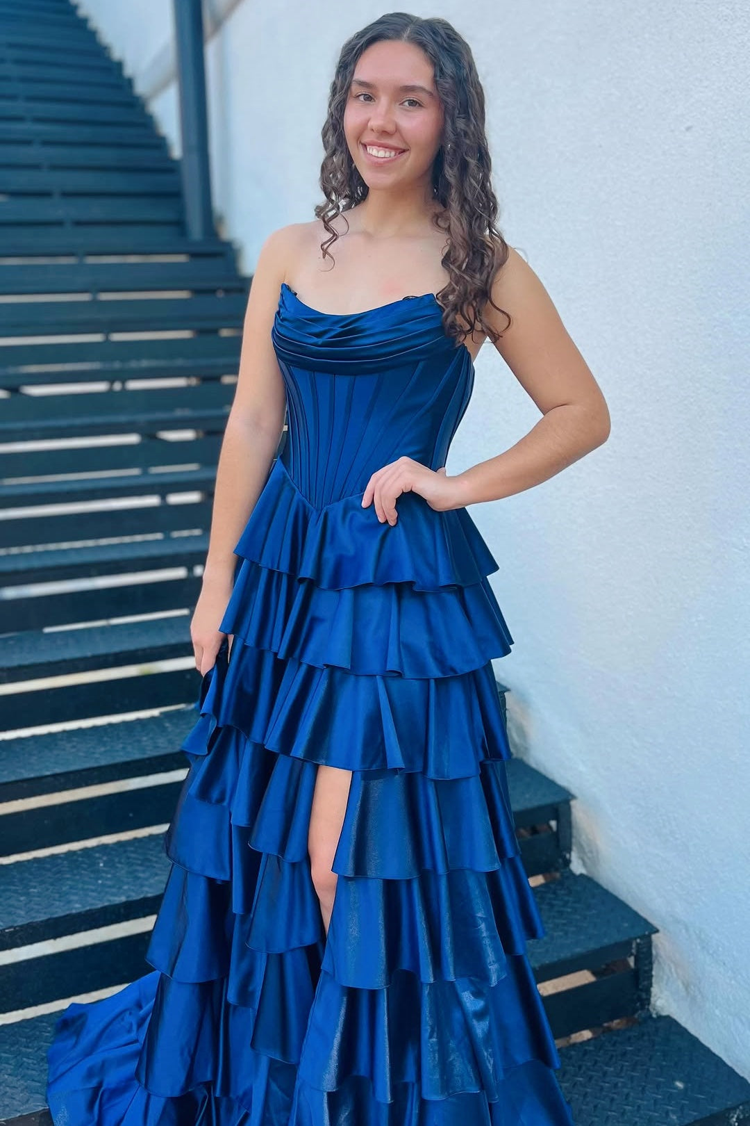 Elevate your prom night with this sophisticated satin gown. The scoop neckline and off-shoulder design create an elegant, modern silhouette that flatters the shoulders and collarbone. Luxurious pleated detailing and tiered layers add dimension and movement, while the A-line cut provides a graceful, flattering fit through the hips. A subtle slit offers ease of movement without compromising the dress's refined aesthetic. Crafted from premium satin fabric, this sleeveless masterpiece delivers the polished, high-impact look you deserve for your special evening.