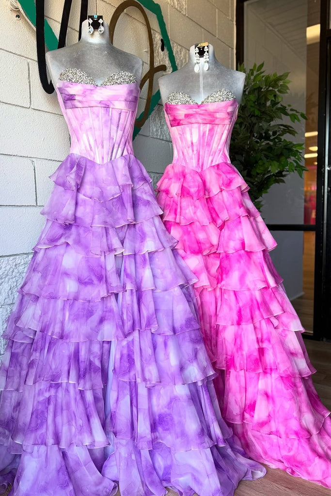 Off-Shoulder Sweetheart Sleeveless Beaded Print-Chiffon Pleated Tiered A-Line Prom Dress
