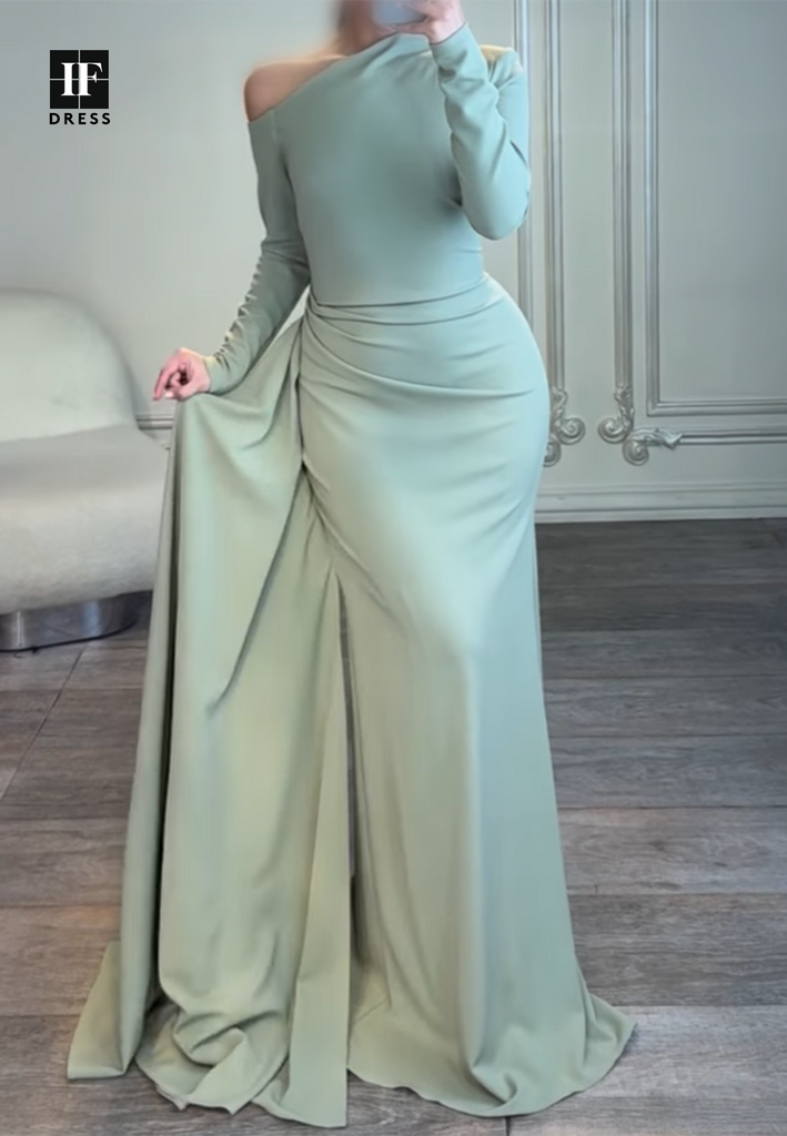 Asymmetrical-Neck Long-Sleeves Formal Gowns Pleated Satin Evening Dress with Sweep Train
