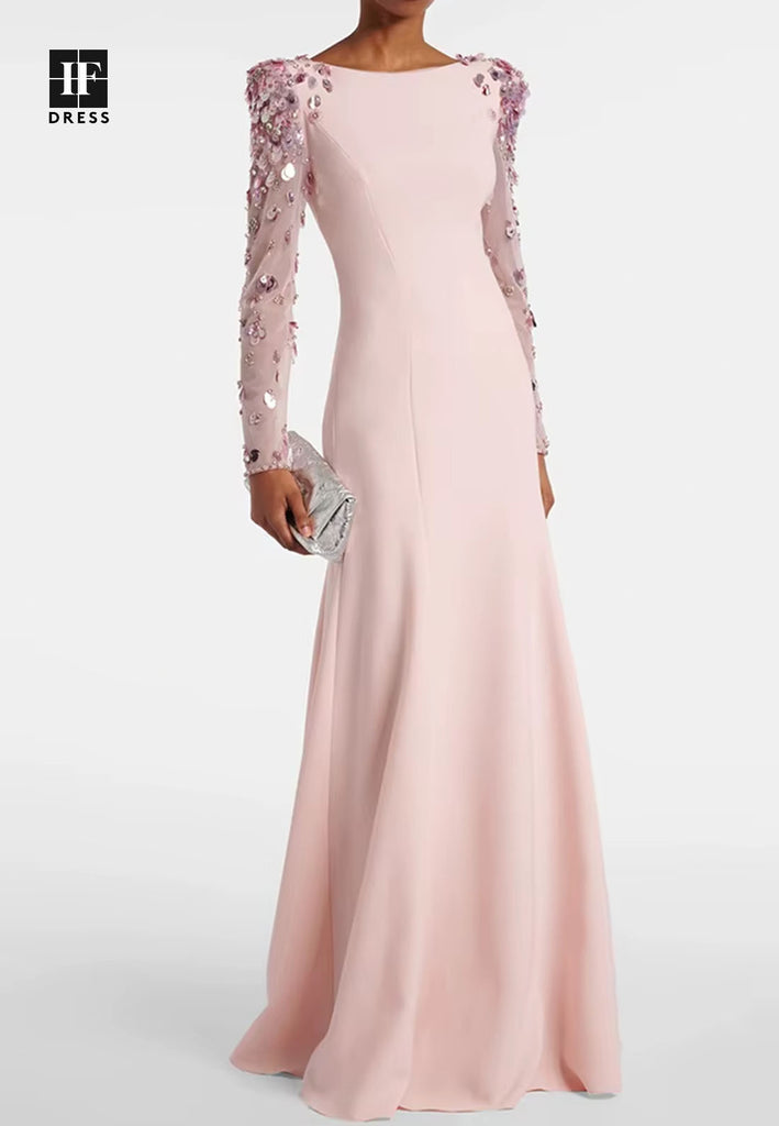 Bateau-Neck Long-Sleeves Meramid Evening Dress Sequined Beaded Satin Formal Gowns