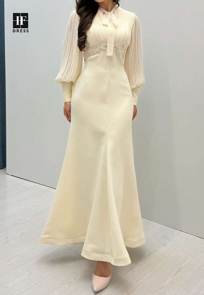 V-Neck Long-Sleeves Ankle-Length Mermaid Evening Dress Beaded Chiffon Pleated Formal Gowns