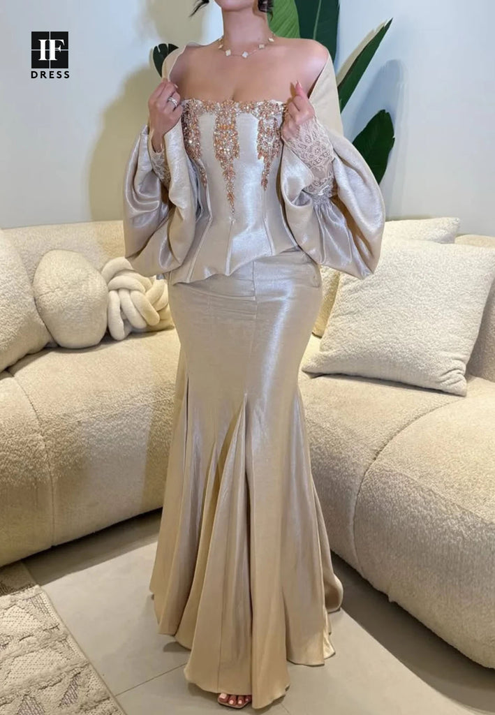 Tube Top Long-Puff-Sleeves Mermaid Evening Dress Rhinestone Pleated Satin&Lace Formal Gowns