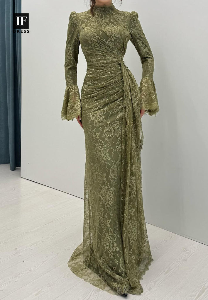 High-Neck Long-Bell-Sleeves Pleated Lace Floor-Length Mermaid Evening Dress