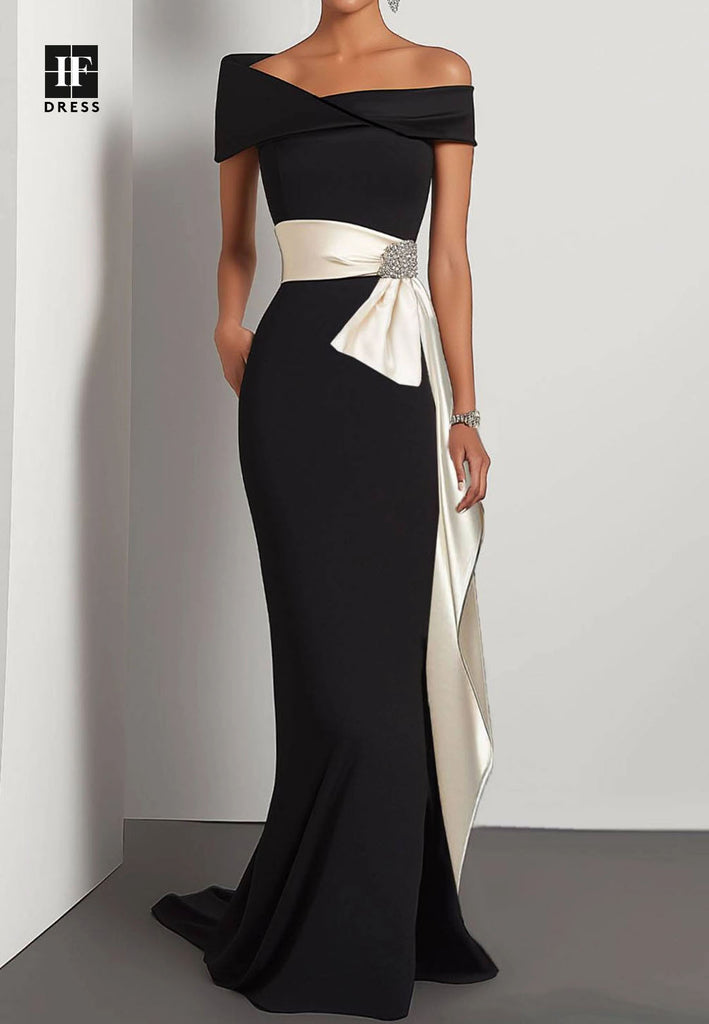 Bateau-Neck Off-Shoulder Sleeveless Sequined Pleated Satin Meramid Evening Dress with Belt