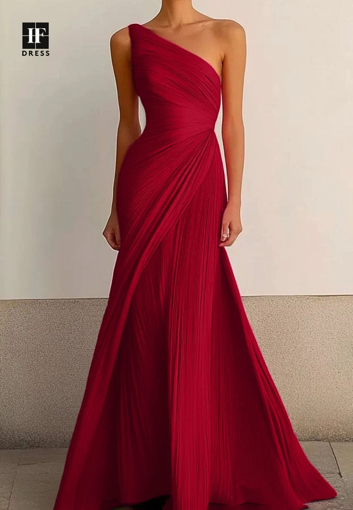 Asymmetrical-Neck Pleated Chiffon Formal Gowns One-Strap Sleeveless Meramid Evening Dress
