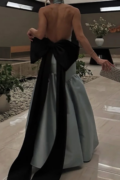 Elegant halter-neck evening dress crafted from luxurious satin with a dramatic floor-length silhouette. Features a flattering trumpet mermaid cut that hugs your curves before flowing gracefully to the floor, paired with a striking oversized bow detail. The sleeveless halter neckline offers a sophisticated, timeless look perfect for formal events, galas, and special occasions. This statement piece combines classic elegance with modern flair for an unforgettable appearance.